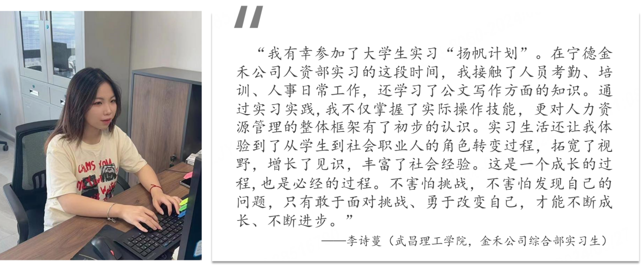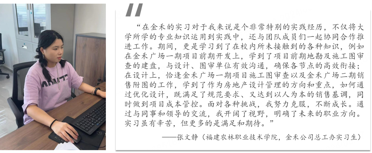 3名实习生划分被分派至金禾公司综合部、人资部、总工办举行实习。历经两个月的事情历练,实习生们对公司的组织运行、营业流程、企业文化等有了基本的相识,为以后在各自岗位上充分验展才华、孝顺价值涤讪了坚实的基础。