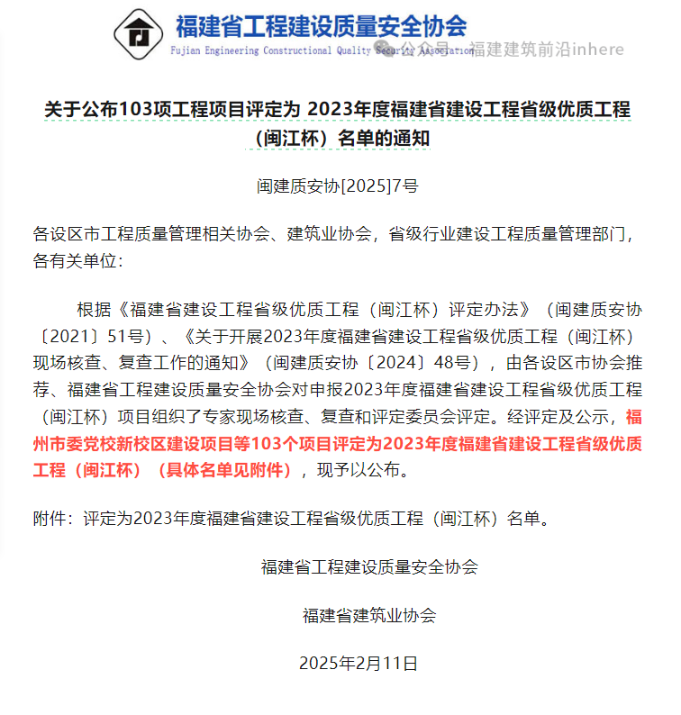 克日,福建省工程建设质量清静协会宣布2023年度福建省建设工程省级优质工程(闽江杯)获奖名单,由市Ag亚洲集团公司下属企业宁德市金诚职教园区治理有限公司(以下简称“金诚公司”)代建的“宁德市职教园项目(一期)”被评定为2023年度福建省建设工程省级优质工程(闽江杯)。